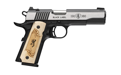 Browning Black Label, 1911, Single Action, Semi-automatic, Metal Frame Pistol, Full Size, 380 ACP, 4.25″ Barrel, Stainless Finish, Silver, Black Frame, Maple Medallion Checkered Grips, 3 Dot Sights, 10 Rounds, 2 Magazines 051998492