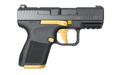 CANIK METE MC9, Semi-automatic, Striker Fired, Polymer Frame Pistol, Micro Compact, 9MM, 3.18″ Barrel, Matte Finish, Black With Gold Accents, Optic Ready, 2 Magazines, (1)-12 Round, (1)-15 Round, Includes 3 Grip Back Straps, Magazine Loader, Custom Holster, Canik Punch and Tool Kit, Cleaning Brush and Jag, Hard Case HG7620G-N