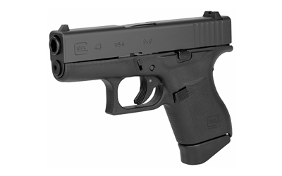 GLOCK 43, Striker Fired, Semi-automatic, Polymer Frame Pistol, Sub-Compact, 9MM, 3.41″ Barrel, Matte Finish, Black, No Finger Grooves, Fixed Sights, 6 Rounds, 2 Magazines UI4350201