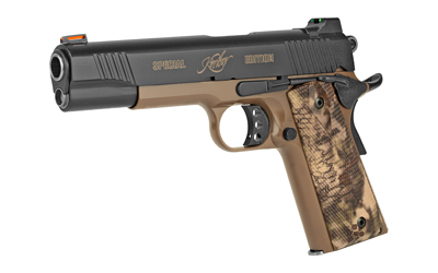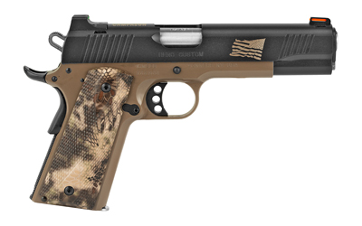 One of the finest all-around 1911 pistols available, complete with fiber optic sights, Kryptek Highlander grips, desert tan frame and a black slide with tan engraving.