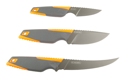 ["(1) Drop point Knife","(1) Boning Knife","(1) Caping Knife","(1) Sharpener","Gray and orange roll pack for convenient storage"]