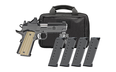 Springfield Operator AOS, 1911, Single Action Only, Semi-automatic, Metal Frame Pistol, Commander Size, 45 ACP, 4.25″ Match Grade Barrel, Aluminum Alloy Frame, Carbon Steel Slide, Cerakote Finish, Black, Optic Ready, VZ G10 Grips, Front White Dot Sight, Tactical Rack White Dot Rear Sight, Ambidextrous Thumb Safety, Viridian Green Dot, 8 Rounds, 4 Magazines, Includes Range Bag PO9228AOS-PAC