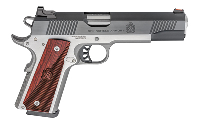Springfield Ronin, 1911, Single Action Only, Semi-automatic, Full Size, 9MM, 5″ Match Grade Barrel, Steel, Blued Slide, Stainless Frame, Wood Grips, Fiber Optic Front Sight, Tactical Rack White Dot Rear Sight, Manual Thumb Safety, 9 Rounds, 1 Magazines PX9119L